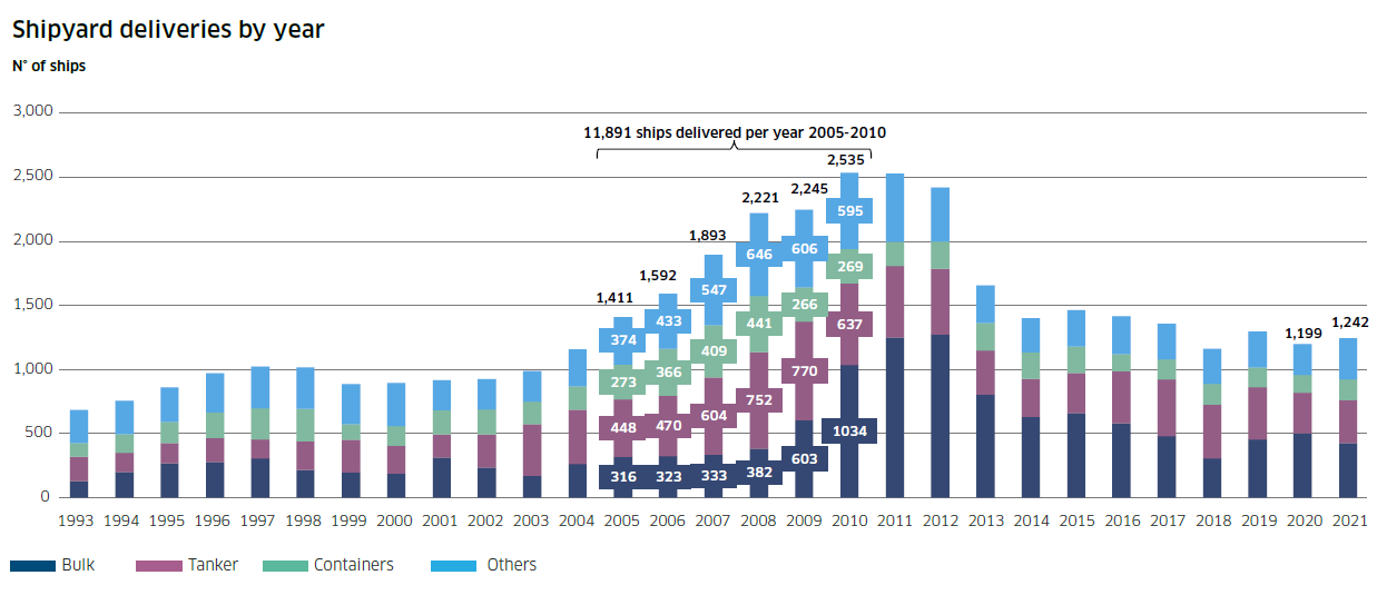 首先,全球造船廠數(shù)量已經(jīng)從2007年的約700家將至目前約300家,在此過程中全球造船產(chǎn)能收縮,目前全球每年能夠建造和交付約1200-1300艘船,遠(yuǎn)低于2005-2010年間平均約2000艘的產(chǎn)能水平。